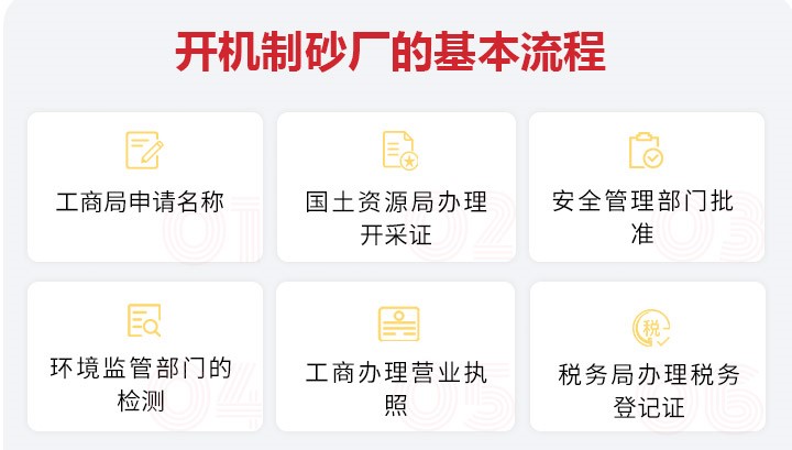 工商局申请名称→国土资源局办理开采证→安全管理部门批准→环境监管部门的检测→工商办理营业执照→税务局办理税务登记证。